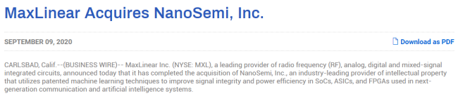 ICC訊(編譯:Nina)美國加州時間2020年9月9日--領(lǐng)先的射頻、模擬和混合信號集成電路供應(yīng)商MaxLinear公司(紐交所:MXL),今天宣布完成收購NanoSemi公司。NanoSemi公司是業(yè)界領(lǐng)先的知識產(chǎn)權(quán)供應(yīng)商,它利用專有的機器學(xué)習(xí)技術(shù)提高下一代通信和人工智能系統(tǒng)中使用的SoC、ASIC和FPGA的信號完整性和功率效率。