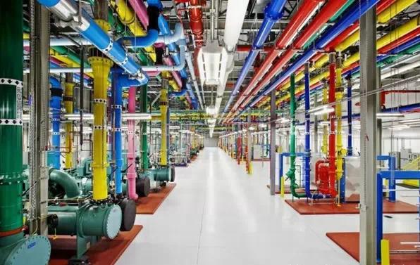 谷歌俄勒岡數(shù)據(jù)中心的這些彩色管道負(fù)責(zé)輸送水。藍(lán)色管道裝冷水,紅色管道裝熱水。
