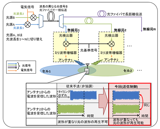 圖3是本次實驗結(jié)構(gòu)示意圖,其結(jié)果是一個被接收的波形。通過進行發(fā)送控制,使來自天線1和天線2的無線電波的定時一致,即使在兩個波形重疊的情況下也能使原始波形不失真地再生。這項實驗結(jié)果便是,來自兩個無線基站的無線電波干擾大幅減少,無干擾通信有望實現(xiàn)。