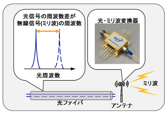圖4是NICT利用迄今為止我們已經(jīng)培育的光纖無線電技術(shù)傳輸毫米波的圖像。 兩個光頻率之間的差被設(shè)置為等于無線電波的頻率,并且在光纖中產(chǎn)生并傳輸具有較小頻率波動的光信號。 在無線基站中,毫米波段中的電信號由兩個光分量的干涉獲得,并且在放大之后,其作為無線電波從天線發(fā)射。 相反,也可以接收毫米波段的無線電波,將其轉(zhuǎn)換成光信號,并將其傳輸?shù)焦饫w中。 由于光纖與銅線電纜相比具有非常小的傳播損耗,所以光纖無線電技術(shù)具有可以長距離傳輸高頻電信號的特征。