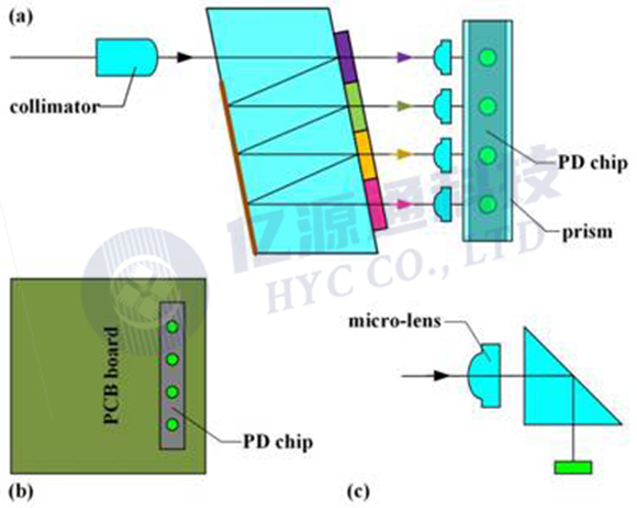 Z-block組件的波分解復(fù)用接收光路如圖3所示,公共端光信號從左側(cè)準直器輸入,各信道的光信號經(jīng)過不同反射次數(shù),透過對應(yīng)的濾波片,經(jīng)微透鏡聚焦在光探測器陣列上的對應(yīng)單元。光探測器陣列貼裝在PCB板上,如圖3(b)所示。在水平面內(nèi)被波分解復(fù)用的光束,需經(jīng)過一個直角棱鏡實現(xiàn)90度轉(zhuǎn)向,沿豎直方向入射在光探測器上。光探測器的有源區(qū)尺寸通常只有Φ50微米,Z-block中傳輸?shù)臏手惫馐睆竭h大于此,因此需要微透鏡聚焦,并且微透鏡需要在垂直光路的橫截面內(nèi),上下左右調(diào)節(jié),以將聚焦光斑對準光探測器的有源區(qū)。這個調(diào)節(jié)對焦過程,也增加了Z-block組裝工藝的復(fù)雜度。