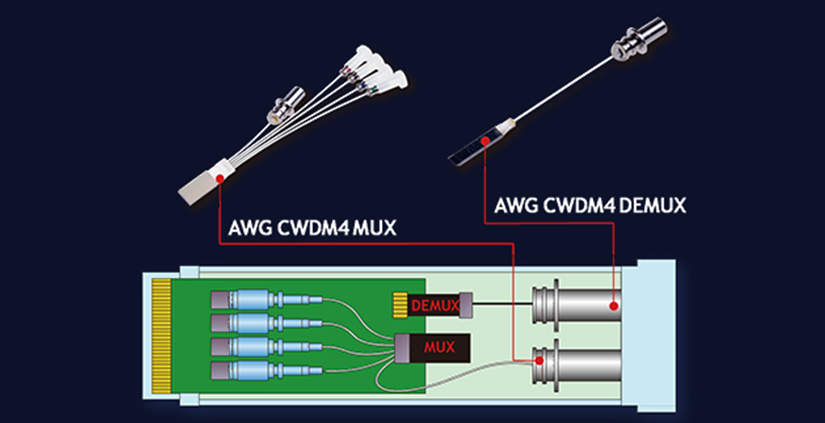 為滿足數(shù)據(jù)中心中長距離傳輸,又要符合降本需求,億源通推出了小尺寸,相對低成本,可封裝在光收發(fā)模塊的AWG CWDM4產(chǎn)品。