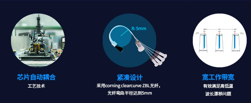 億源通的 AWG CWDM4模塊基于硅基芯片技術(shù),擁有緊湊性、易組裝的結(jié)構(gòu)以及很好的可靠性,每個ITU通帶均有足夠的工作帶寬,在高低溫的影響下都可以保持ITU理想的插入損耗指標。該AWG CWDM4器件可安裝在狹窄的空間內(nèi),其主體尺寸能壓縮到長15x寬2x高2mm以內(nèi),且采用的是Corning ClearCurve ZBL光纖,該光纖彎曲半徑達到了5mm,幾乎零彎曲損耗,具有高保真、高傳輸速率。