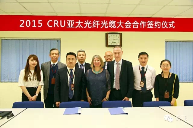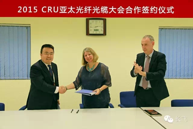 ICCSZ訊 2015年5月13日下午,長飛光纖光纜股份有限公司總裁莊丹博士、第一副總裁楊幫卡先生與CRU(英國商品研究所)Events首席執(zhí)行官Nicola Coslett 女士簽署了2015年CRU亞太光纖光纜大會合作協(xié)議。