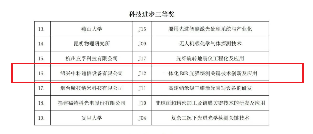 近日,第九屆“中國光學工程學會科學技術獎”獲獎名單公示——紹興中科通信設備有限公司的《一體化BOB光貓綜測關鍵技術創(chuàng)新及應用》項目獲評科技進步三等獎。