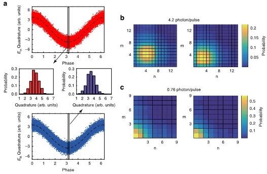 為了解決寬帶量子存儲(chǔ)的效率問題,研究團(tuán)隊(duì)通過理論與實(shí)驗(yàn),細(xì)致分析了在光與原子量子耦合過程中,泵浦光場(chǎng)、控制光場(chǎng)與原子自旋波激發(fā)的關(guān)聯(lián)機(jī)制,從而掌握了最大優(yōu)化量子轉(zhuǎn)換的實(shí)際條件與方法。通過優(yōu)化,實(shí)時(shí)操控光和原子的分束比,有效掌控遠(yuǎn)失諧光量子信息向原子存儲(chǔ)器轉(zhuǎn)換的效率。理論上,針對(duì)任意波形待存儲(chǔ)的光量子信息模擬給出最優(yōu)的控制光場(chǎng)波形,實(shí)驗(yàn)上逐步研究不同控制光時(shí)間波形對(duì)存儲(chǔ)效率帶來的差異性,由此確證了優(yōu)化控制光場(chǎng)波形與高效存儲(chǔ)的直接關(guān)聯(lián)性,最終實(shí)現(xiàn)了6-20 ns多種脈寬的光信號(hào)存儲(chǔ),且量子效率均達(dá)82.0%以上。原子系綜存儲(chǔ)器的存儲(chǔ)時(shí)間受原子相干時(shí)間限制,通常為微秒量級(jí)。在存儲(chǔ)時(shí)間內(nèi)能夠?qū)崿F(xiàn)連續(xù)近百個(gè)納秒量級(jí)寬度的光量子存儲(chǔ)。此外,團(tuán)隊(duì)對(duì)寬帶存儲(chǔ)信號(hào)的量子特性也進(jìn)行了量子表征研究。利用量子態(tài)層析技術(shù)(quantum tomography),通過對(duì)輸入輸出信號(hào)光場(chǎng)的量子態(tài)進(jìn)行層析掃描,結(jié)果表明在高效量子存儲(chǔ)條件下,存儲(chǔ)系統(tǒng)也具備低噪聲特性,噪聲僅為0.02個(gè)光子/每存儲(chǔ)過程。這也保證了在單光子水平的信號(hào)光場(chǎng)強(qiáng)度下,系統(tǒng)的量子保真度能夠達(dá)到98%。