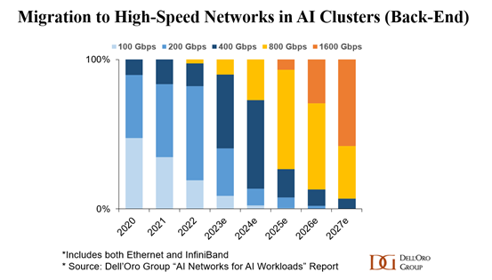 ICC訊 隨著AIGC應用和大模型的出現(xiàn),催生了AI算力需求的激增,進而也推動著數(shù)據(jù)中心基礎部件-光模塊迭代升級步伐的加快。光模塊速率開始向800G邁進,更有不少龍頭企業(yè)已經(jīng)開始布局1.6 Tbps光模塊。Dell 'Oro預測:到 2025 年,人工智能網(wǎng)絡中的大多數(shù)端口將達到 800 Gbps,到 2027年,大多數(shù)端口將達到1600 Gbps,呈現(xiàn)出非??斓乃俣?。