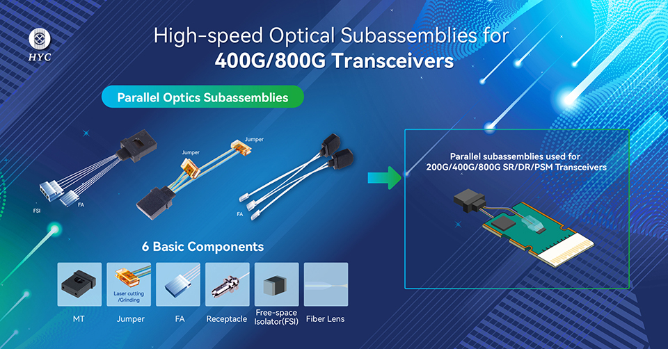 在今年的OFC展會上“AI”是一個熱點話題,也可以看到各大光模塊廠商紛紛展示800G、1.6T,并且很多已經(jīng)開始在探索3.2T方案。800G光模塊的需求上升,也將帶動應用于光模塊內(nèi)部與外部互聯(lián)的微連接無源光組件的需求增長,如EML方案的800G需要透鏡、隔離器、FA、FR4/LR4的Z-block/AWG等?;诟呙芏炔⑿泄鈱W和自由空間光學設計與制造的核心技術能力,億源通(HYC)可提供并行和波分兩種方案的高速光組件,應用于200G/400G/800G或更高速率的長距和短距光收發(fā)模塊。