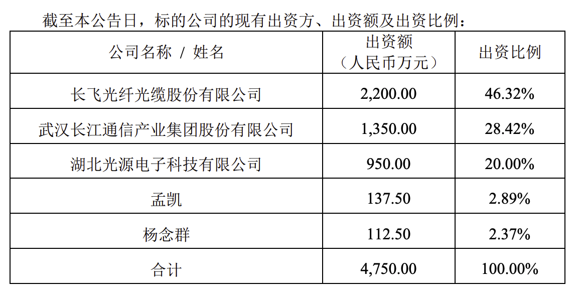 截止至公告日,長飛光系統(tǒng)出資比例如下:長飛光纖、長江通信、湖北光源電子、孟凱及楊念群分別為46.32%、28.42%、20%、2.89%及2.37%。于收購事項完成后,長飛光系統(tǒng)將成為長飛光纖的非全資附屬公司。