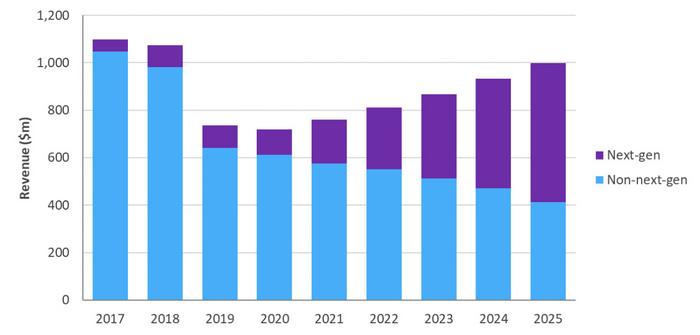 圖2:下一代與非下一代Cable寬帶接入設(shè)備市場,2017-2025年。