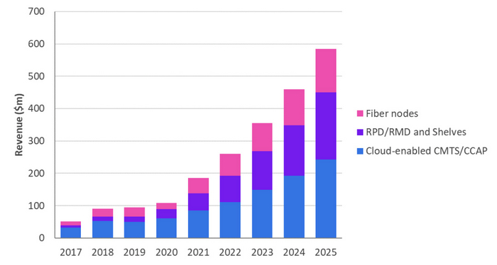 圖3:按設(shè)備類型劃分的下一代Cable寬帶接入設(shè)備市場,2017-2025年。