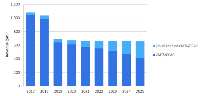 ·基于云的CMTS/CCAP收入預(yù)計在2025年將增至2.42億美元,2020-2025年期間的年復(fù)合增長率為32%,占2025年集中式設(shè)備收入的37%。盡管這一增長并不足以抵消在預(yù)測期內(nèi)集中式接入設(shè)備的整體下滑,但在未來幾年,基于云的CMTS/CCAP將最終超過傳統(tǒng)的CMTS/CCAP。這將發(fā)生在Cable運營商努力提高前端效率的過程中,以及Cable供應(yīng)商將其Cable運營商客戶轉(zhuǎn)移到許可和“按需購買”模式來支持進一步收入增長時。