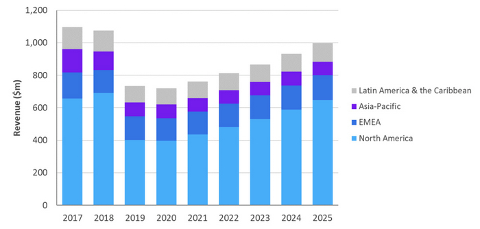 推動這一預(yù)測的是在前端和外部部署空間的下一代技術(shù)。集中式接入設(shè)備收入將在2018-2025年期間下降,年復(fù)合增長率為-6%,到2025年將降至6.56億美元。基于云的CMTS/CCAP增長抵消了該細分市場的進一步下滑,預(yù)計在整個預(yù)測期內(nèi),這部分的增長將非常顯著。分布式接入設(shè)備預(yù)計在2018-2025年期間將以37%的年復(fù)合增長率增長。在預(yù)測期內(nèi),這一新興細分領(lǐng)域的出貨量將達到商用水平,到2025年收入將接近3.42億美元。北美仍將是Cable寬帶接入設(shè)備的主要消費者,占設(shè)備總收入的65%。盡管整體市場將從2019-2020年的下跌趨勢中反彈,但支出水平在2018-2025年期間將呈現(xiàn)-1%的年復(fù)合增長率。