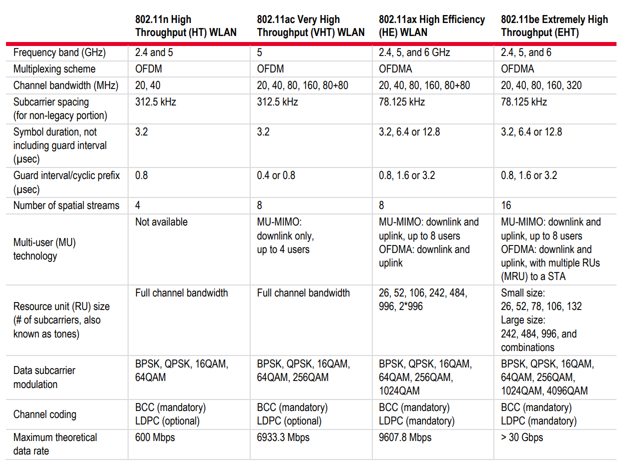 表 1:802.11n、802.11ac、802.11ax 和 802.11be 的物理層對(duì)比