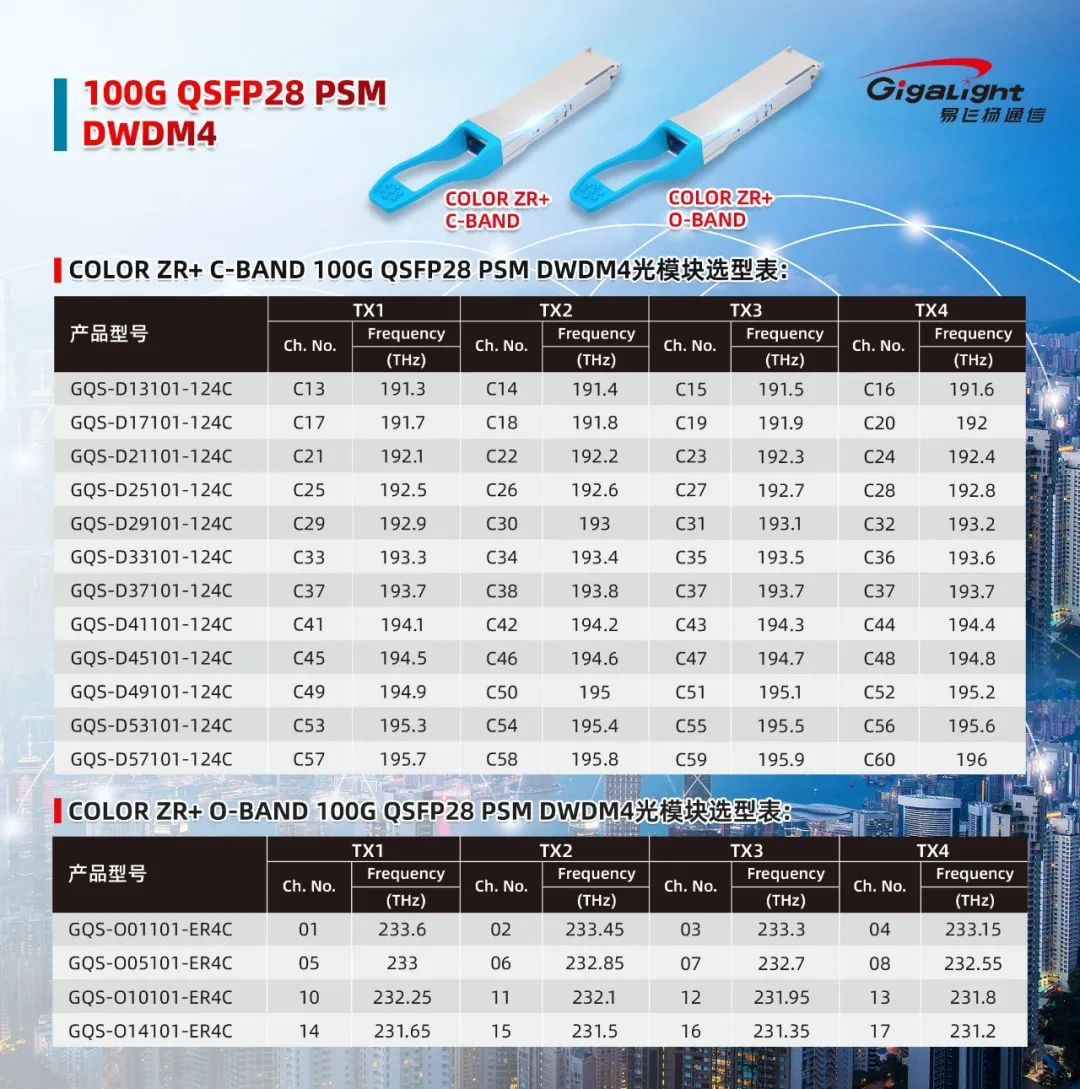 100G QSFP28 PSM DWDM4(C-BAND/O-BAND)波長表
