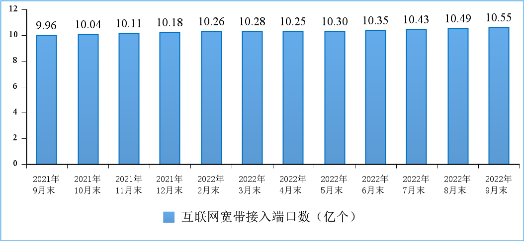千兆網(wǎng)絡(luò)服務(wù)能力持續(xù)提升。截至9月末,全國互聯(lián)網(wǎng)寬帶接入端口數(shù)量達10.55億個,比上年末凈增3698萬個。其中,光纖接入(FTTH/O)端口達到10.08億個,比上年末凈增4774萬個,占互聯(lián)網(wǎng)寬帶接入端口的95.5%,占比較上年末提高1.2個百分點。截至9月末,具備千兆網(wǎng)絡(luò)服務(wù)能力的10G PON端口數(shù)達1268萬個,比上年末凈增482.2萬個。
