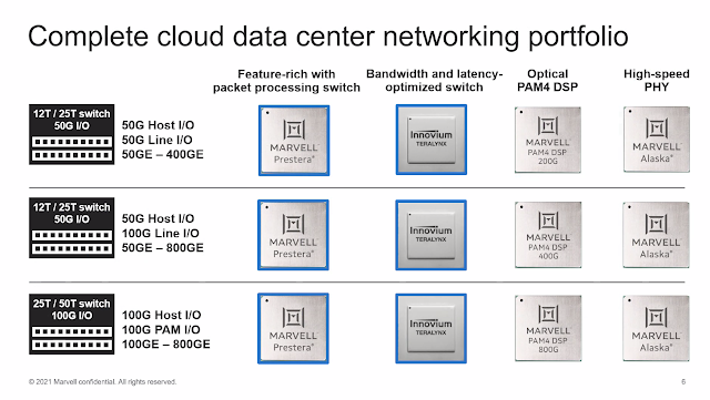 Marvell擁有廣泛的功能豐富的以太網(wǎng)交換機(jī)半導(dǎo)體解決方案組合,在其服務(wù)的企業(yè)和運(yùn)營(yíng)商細(xì)分市場(chǎng)中占據(jù)強(qiáng)大且不斷增長(zhǎng)的地位。鑒于Marvell在云數(shù)據(jù)中心市場(chǎng)的增長(zhǎng)勢(shì)頭,隨著最近對(duì)Inphi的收購(gòu)而進(jìn)一步增強(qiáng),開發(fā)用于超大規(guī)模數(shù)據(jù)中心的專用高基數(shù)、性能優(yōu)化的交換機(jī)硅對(duì)于公司來(lái)說(shuō)具有越來(lái)越大的戰(zhàn)略重要性。