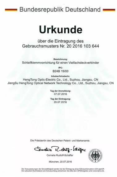 Iccsz訊 近日,亨通通信產(chǎn)業(yè)集團(tuán)江蘇亨通光網(wǎng)科技有限公司“一種適用于云計算多芯連接器的研磨夾具裝置”PCT專利授權(quán)并榮獲德國授權(quán)證書。