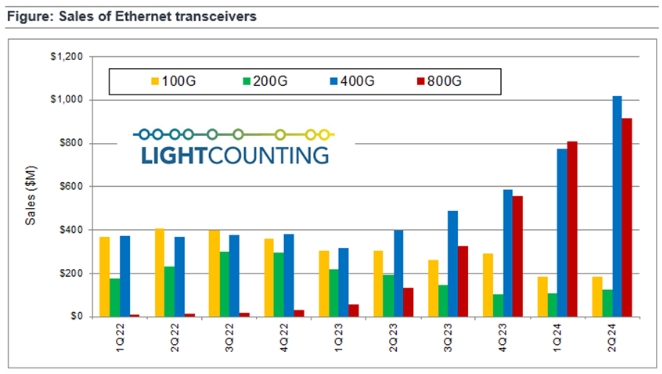 摘要:2024年第二季度,以太網(wǎng)光模塊的銷售額同比增長(zhǎng)了100%。大部分增長(zhǎng)來自對(duì)400G和800G模塊的強(qiáng)勁需求。