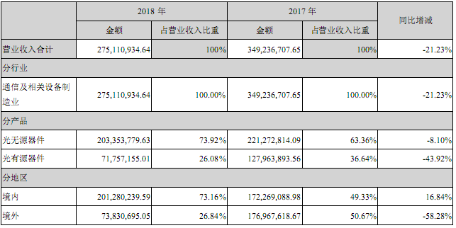 按市場劃分,報告期內(nèi),國內(nèi)光纖到戶建設需求有所下降,DWDM器件需求相對平穩(wěn),下半年進入合并報表的成都迪譜PON光模塊銷售增長較快。公司2018年實現(xiàn)境內(nèi)銷售收入2.01億元,比上年同期增長16.84%,占總銷售收入的73.16%。在境外市場方面,光分路器市場需求較為穩(wěn)定,但因為公司有源器件業(yè)務的主要境外客戶Kaiam公司進行產(chǎn)品結(jié)構(gòu)調(diào)整,導致訂單需求大幅下降。公司2018年實現(xiàn)境外銷售收入0.74億元,比上年同期下降58.28%,占總銷售收入的26.84%。