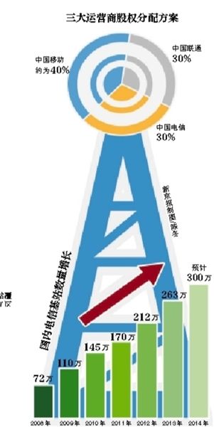 據(jù)了解,目前暫定的鐵塔公司中,三家公司股權(quán)分配方案是:中國移動(dòng)將占有最大份額,約為40%,中國聯(lián)通和中國電信兩家各占30%。不過也有媒體采訪三大運(yùn)營商,稱目前尚沒有達(dá)成任何最終協(xié)議。