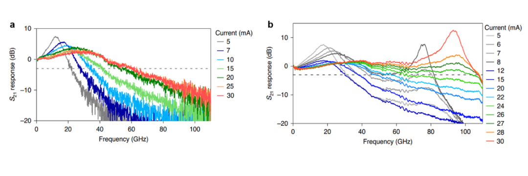 在不引入光子共振效應(yīng)時(shí),器件大約能獲得60GHz的本征帶寬。通過在95GHz頻率處引入光子共振效應(yīng),3dB調(diào)制帶寬提升至108GHz。