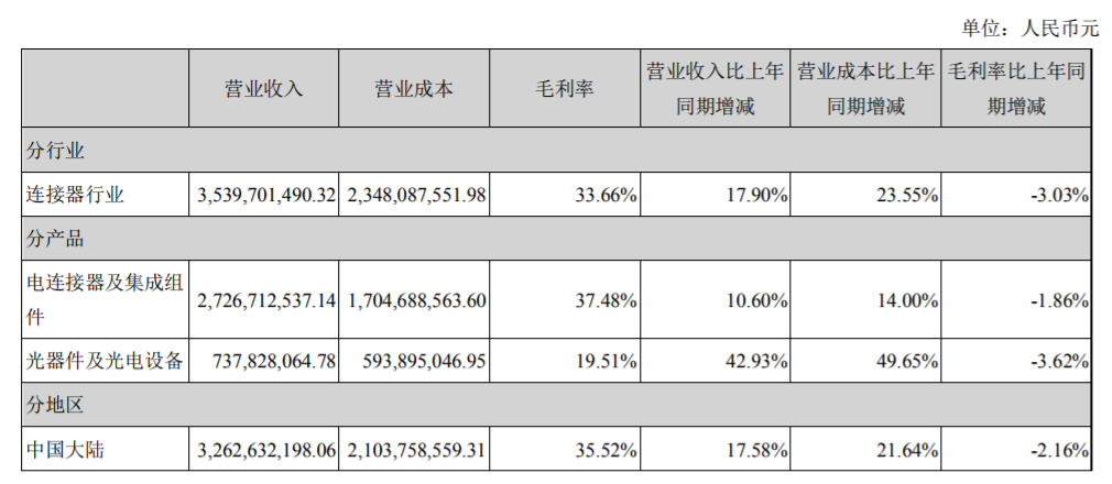 報告期內(nèi),公司對“分產(chǎn)品”統(tǒng)計口徑做出調(diào)整。與2018年報告相比,"電連接器、線纜組件及集成產(chǎn)品"合并調(diào)整為"電連接器及集成組件"。2018年相關(guān)數(shù)據(jù)已按照新統(tǒng)計口徑調(diào)整。