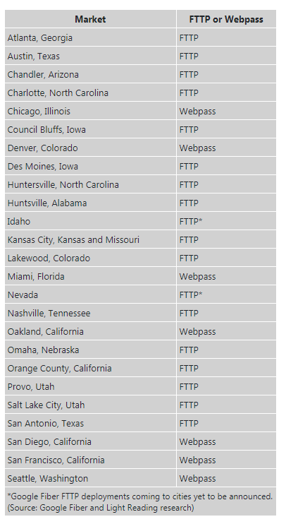 以下是谷歌Fiber目前提供或計(jì)劃通過(guò)FTTP或固定無(wú)線Webpass服務(wù)提供的地方:
