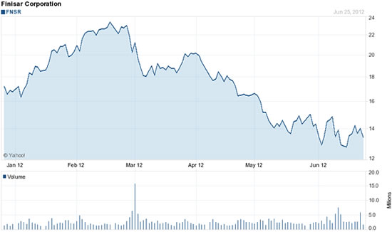 【訊石光通訊咨詢網(wǎng)】今年截止到目前,Finisar股票下降了24%,進(jìn)入紅區(qū)。繼發(fā)布混合第四季度(與去年同期相比營收稍微有改善,GAAP每股營收卻下降顯著)結(jié)果后,股票在將之拉出低迷狀態(tài)上并沒有起多大作用。雖然Finisar 2012 Q4營收只略微高過原預(yù)期營收區(qū)間的下限(Finisar 2012 Q4營收2.4億美元,原預(yù)期營收區(qū)間為2.35-2.5億美元),但在營收預(yù)期上還是無計(jì)可施。加之,暗淡的前景無法激起投資者的信心。