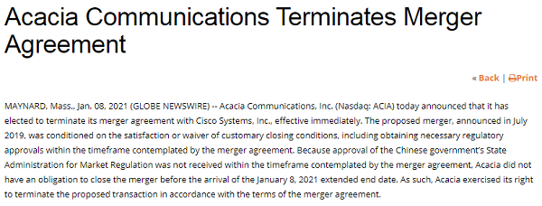 ICC訊(編譯:Nina)美國馬薩諸塞州MAYNARD,2021年1月8日--Acacia Communications公司(納斯達克:ACIA)今天宣布已選擇終止與Cisco Systems(思科系統(tǒng))公司的合并協(xié)議,該決定立即生效。擬議中的合并于2019年7月宣布,其條件是滿足或放棄慣常的成交條件,包括在合并協(xié)議規(guī)定的期限內(nèi)獲得必要的監(jiān)管批準。由于并購協(xié)議未在規(guī)定的期限內(nèi)獲得中國政府國家市場監(jiān)督管理總局的批準,Acacia沒有義務(wù)在2021年1月8日的延長終止日期到來之前完成合并。因此,Acacia根據(jù)合并協(xié)議的條款行使了終止擬議交易的權(quán)利。