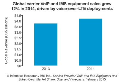 ICCSZ訊 近日,市場(chǎng)調(diào)研公司Infonetics發(fā)布其最新的關(guān)于IP電話(VoIP)和IP多媒體子系統(tǒng)(IMS)設(shè)備市場(chǎng)報(bào)告。該報(bào)告指出,在2014年VoIP和IMS設(shè)備市場(chǎng)增長12%,至42億美元。推動(dòng)該市場(chǎng)發(fā)展的主要?jiǎng)恿碜赃\(yùn)營商不斷地改造自己的網(wǎng)絡(luò),以更簡(jiǎn)單,更具成本效益,并且能夠提供下一代語音服務(wù),主要是LTE語音(VoLTE)。