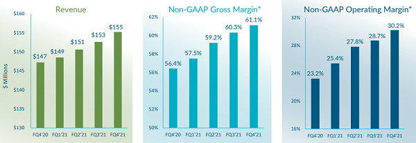 銷售收入1.55億美元,同比增長5.4%,環(huán)比增長1.7%。GAAP毛利率58.1%,去年同期52.8%,上個季度57.2%。非GAAP毛利率61.1%,去年同期56.4%,上個季度60.3%。GAAP凈收入1710萬美元,或每股攤薄盈利0.24美元,去年同期凈收入1750萬美元,或每股攤薄盈利0.22美元,上個季度凈收入1500萬美元,或每股攤薄盈利0.21美元。非GAAP凈收入4330萬美元,或每股攤薄盈利0.61美元,去年同期凈收入2760萬美元,或每股攤薄盈利0.40美元,上個季度凈收入4030萬美元,或每股攤薄盈利0.57美元。
