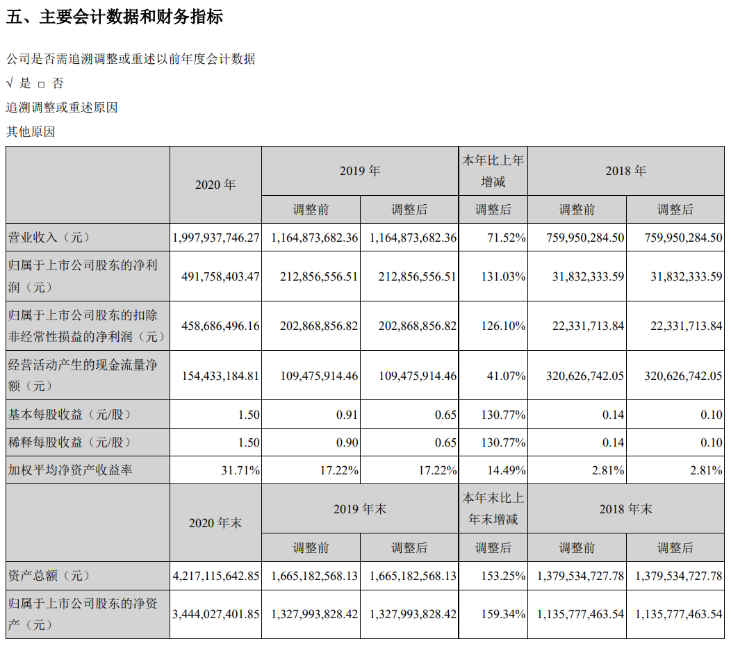 摘要:2020年公司實(shí)現(xiàn)營(yíng)業(yè)收入19.98億元,歸屬于上市公司股東的凈利潤(rùn)4.92億元,較上年分別增加71.52%和131.03%。2021一季度公司實(shí)現(xiàn)營(yíng)業(yè)收入6.24億元,歸屬于上市公司股東的凈利潤(rùn)1.12億元,分別同比增長(zhǎng)131.21%和99.95%。