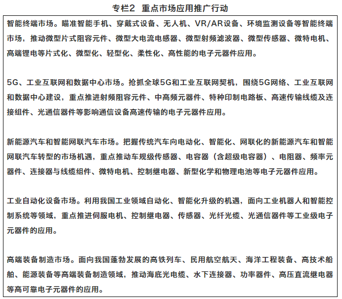 《行動(dòng)計(jì)劃》提出強(qiáng)化市場應(yīng)用推廣,在5G、工業(yè)互聯(lián)網(wǎng)和數(shù)據(jù)中心市場方面,搶抓全球5G和工業(yè)互聯(lián)網(wǎng)契機(jī),圍繞5G網(wǎng)絡(luò)、工業(yè)互聯(lián)網(wǎng)和數(shù)據(jù)中心建設(shè),重點(diǎn)推進(jìn)射頻阻容元件、中高頻元器件、特種印制電路板、高速傳輸線纜及連接組件、光通信器件等影響通信設(shè)備高速傳輸?shù)?A href="http://n2software.net/site/CN/Search.aspx?page=1&keywords=%e7%94%b5%e5%ad%90%e5%85%83%e5%99%a8%e4%bb%b6&column_id=ALL&station=%E5%85%A8%E9%83%A8" target="_blank">電子元器件應(yīng)用。在工業(yè)自動(dòng)化設(shè)備市場方面,利用我國工業(yè)領(lǐng)域自動(dòng)化、智能化升級的機(jī)遇,面向工業(yè)機(jī)器人和智能控制系統(tǒng)等領(lǐng)域,重點(diǎn)推進(jìn)伺服電機(jī)、控制繼電器、傳感器、光纖光纜、光通信器件等工業(yè)級電子元器件的應(yīng)用。