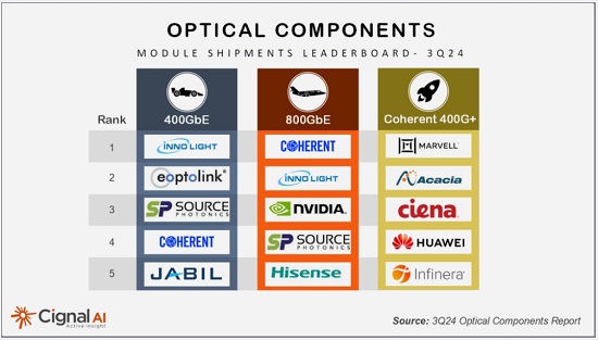 旭創(chuàng)繼續(xù)保持400G數(shù)據(jù)通信發(fā)貨量的領(lǐng)先地位,但在800G市場中Coherent占據(jù)了首位。Nvidia由Fabrinet提供的800G解決方案則以最快的生產(chǎn)速度成為第三大模塊來源。