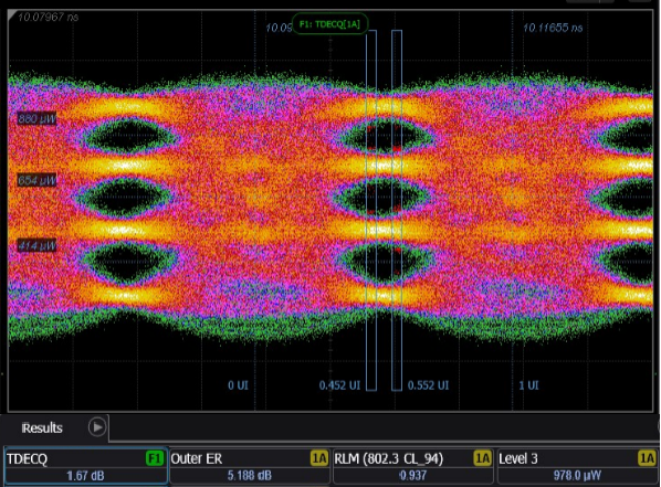 目前這兩款光模塊已完成性能驗(yàn)證,性能優(yōu)良,TDECQ可以達(dá)到2dB以內(nèi),各項(xiàng)光電指標(biāo)優(yōu)于IEEE 802.3CU、100G Lambda MSA、QSFP28 MSA等協(xié)議要求。