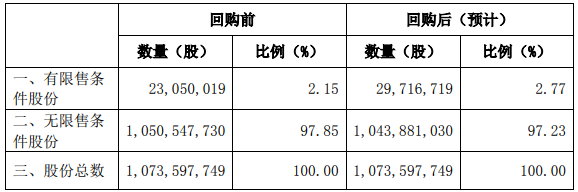 按回購資金總額下限1億元,預(yù)計公司股本結(jié)構(gòu)變動情況如下: