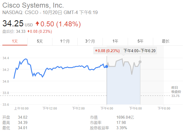 思科股價也在盤后上漲0.23%,報34.25美元。