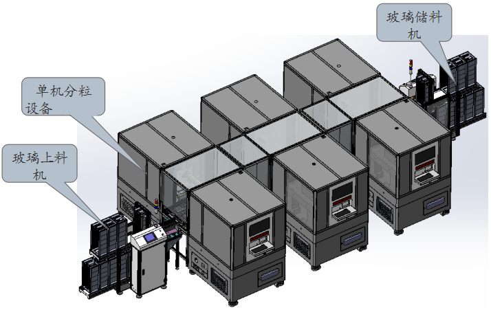 玻璃切割自動(dòng)化產(chǎn)線,將多臺(tái)的單一玻璃切割設(shè)備融合在一條生產(chǎn)線