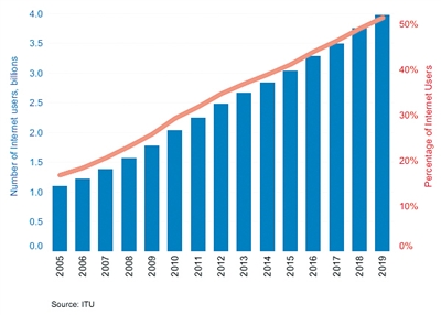國際電聯(lián)估計,到2019年底,全球使用互聯(lián)網(wǎng)的人口比例略高于51%,即40億人。