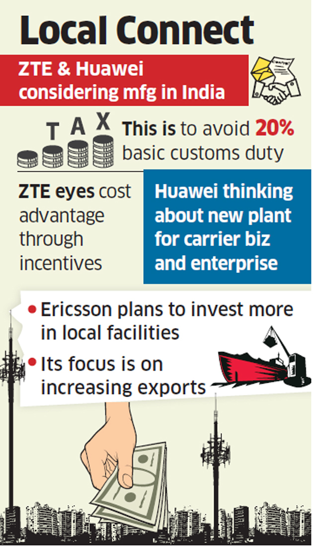 據(jù)印度經(jīng)濟(jì)時(shí)報(bào)報(bào)道,中國(guó)電信設(shè)備供應(yīng)商華為和中興通訊正考慮在印度進(jìn)行設(shè)備產(chǎn)品制造,從而避免印度政府去年開(kāi)始征收的20%基本關(guān)稅。瑞典愛(ài)立信公司則計(jì)劃增加在印度當(dāng)?shù)氐耐顿Y來(lái)增加出口。