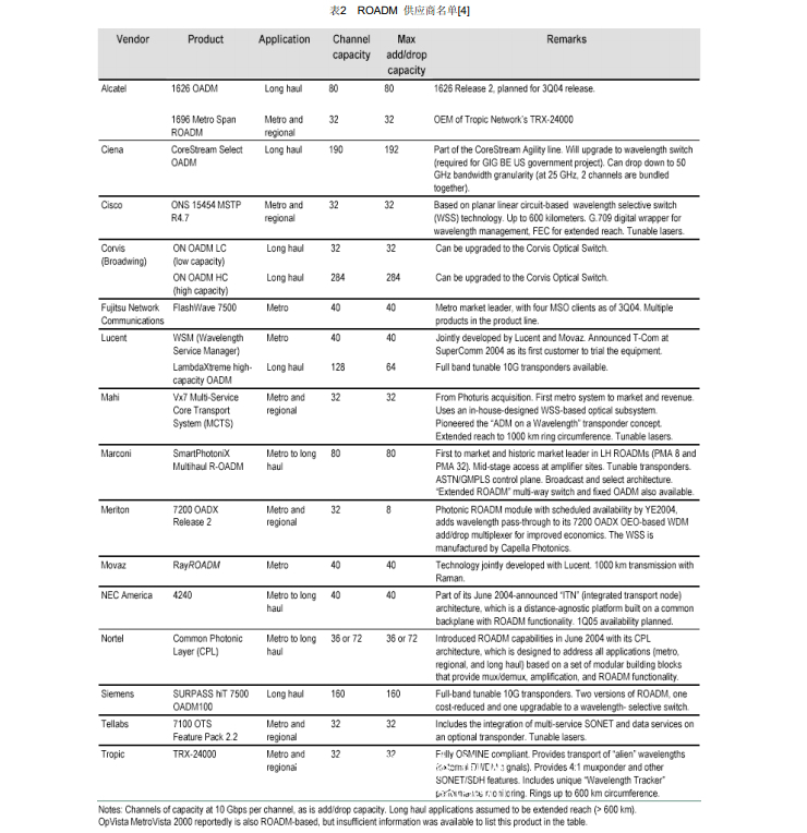 ROADM 的市場可以分為城域,即城市范圍內(nèi),和長途,特別是延長距離(>600km)城市之間的應(yīng)用??蛻舻男枨?、和多數(shù)情況下提供的產(chǎn)品可以是大不相同的。城域應(yīng)用又可細(xì)分為基礎(chǔ)設(shè)施 – ROADM由運營商裝備作為公共網(wǎng)絡(luò)利用,和客戶接入管理服務(wù) – 典型情況是設(shè)備提供的管理服務(wù)賣給專門的客戶。根據(jù) RHK 在2005年的統(tǒng)計,主要的 ROADM 產(chǎn)品和供應(yīng)商如表2所列[4]。