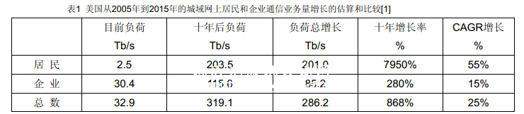 當(dāng)電信業(yè)務(wù)量以語音為主時,一般來說其業(yè)務(wù)量每年約以 8~10% 遞增。如今増加了數(shù)據(jù)和視頻業(yè)務(wù),每年業(yè)務(wù)量増長超過 50~100%??梢灶A(yù)期今后十年由于大量消費業(yè)務(wù)的寬帶服務(wù)(如 IPTV、VoD等),在城域光網(wǎng)上居民方面的寬帶通信負(fù)荷增長速度將遠(yuǎn)遠(yuǎn)超過企業(yè)方面。有人就美國從2005年到2015年的城域網(wǎng)上居民和企業(yè)通信業(yè)務(wù)量増長作了估算和比較。十年內(nèi)總增長268Tb /s,大部分是由于消費性的高速寬帶服務(wù)的大量提供。表1是對美國從2005年到2015年的城域網(wǎng)上居民和企業(yè)通信業(yè)務(wù)量増長的估算和比較。