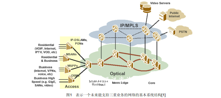 圖1表示一個未來能支持三重業(yè)務(wù)的網(wǎng)絡(luò)的基本系統(tǒng)結(jié)構(gòu),包括三主要部分:接入、IP/MPLS 和光層。靈活性光層對服務(wù)的接入網(wǎng)和IP/MPLS 網(wǎng)絡(luò)層提供全部傳輸和路由,同時也能直接遞送一些服務(wù)到終端用戶,例如高速以太網(wǎng)或 SAN 等。