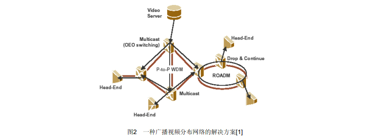 圖2表示一種廣播視頻分布網(wǎng)絡(luò)解決方案,包括 ROADM、OEO波長開關(guān)和分出/繼續(xù)(Drop & Continue)。柔性是靈活光網(wǎng)的主要特征,ROADM 和 WXC 平臺是多媒體三重業(yè)務(wù)光網(wǎng)的關(guān)鍵部分。提高網(wǎng)絡(luò)的靈活性和降低建設(shè)成本和運行維護(hù)費用是發(fā)展中城域光網(wǎng)和接入光網(wǎng)的主要目標(biāo)之一。