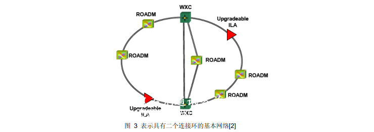 以往的 DWDM 城域光網(wǎng)只是包括3-6個節(jié)點的小型環(huán)網(wǎng)。發(fā)展中的城域光網(wǎng)的系統(tǒng)結(jié)構(gòu)應(yīng)是能支持包括20-50個節(jié)點群的網(wǎng)格網(wǎng)。為降低這種擴(kuò)大光網(wǎng)的成本,無再生的光透明傳輸距離至少應(yīng)達(dá)1000公里,包含的光網(wǎng)節(jié)點在16個以上。為了使網(wǎng)絡(luò)結(jié)構(gòu)能不斷擴(kuò)展,每個節(jié)點的連接維度必須在不影響現(xiàn)有業(yè)務(wù)的情況下增加,網(wǎng)格網(wǎng)的節(jié)點的連接應(yīng)能擴(kuò)充到 8 度。圖 3 表示具有二個連接環(huán)的基本網(wǎng)絡(luò)[2],在二個環(huán)的連接處的節(jié)點是 4 度WXC,其他的節(jié)點都是2度ROADM,其中還有二個節(jié)點是可升級的在線放大器ILA。