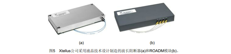 成的ROADM系統(tǒng)[2],圖中只表示了單方向的信號流。因為這里沒有實際的交換發(fā)生,波長阻斷器有時被看成為 1x1光開關(guān)。阻斷器通常采用液晶技術(shù),但其他方法也可用如 MEMS 等。波長阻斷器利用一組連續(xù)的單元以阻斷波譜,它能支持不同的信道間隔,例如100Gb/s和50Gb/s混合的信道可由單個器件提供。這能力目前尚未在任何現(xiàn)有系統(tǒng)上應(yīng)用,但能提供今后10Gb/s和40Gb/s混合系統(tǒng)采用的可能。波長阻斷器是成熟技術(shù),但由于解決方案不易集成使成本比較高。圖5是Xtellus公司采用液晶技術(shù)設(shè)計制造的波長阻斷器和ROADM模塊。Xtellus 波長阻斷器可以應(yīng)用于C波段或L波段間隔為100GHz或50GHz的DWDM系統(tǒng),插入損耗小于5dB, 消光比大于40dB,動態(tài)均衡可達(dá)15dB。Xtellus 的ROADM模塊具有波長分出、插入、阻斷和直通、均衡和功率監(jiān)視等功能,可用于C波段或L波段間隔為100GHz的DWDM系統(tǒng),輸入到輸出的全部插入損耗不大于8.5 dB, 功耗低于4w。