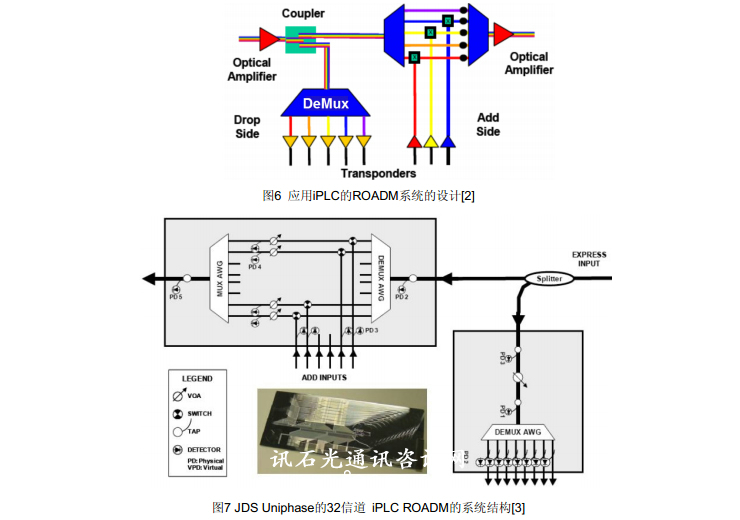利用集成平面光路(iPLC)技術(shù)的ROADM相對于波長阻斷器由于或是直通或是插入到輸出之間增加了交換使設(shè)計增添復(fù)雜度。iPLC 通常采用陣列波導(dǎo)光柵 (AWG) 將信號分出不同波長以及利用熱驅(qū)動的MZI開關(guān)改變或是直通或是插入的波長路徑。應(yīng)用iPLC的ROADM系統(tǒng)的設(shè)計如圖6所表示,通過集成化可以降低成本,但也與用波長阻斷器一樣不能構(gòu)成網(wǎng)格。目前iPLC技術(shù)初步應(yīng)用的是小規(guī)模開關(guān)(2 x1)。要構(gòu)成規(guī)模大的開關(guān)模塊比較困難,因為當(dāng)輸入和輸出之間交叉數(shù)量增加時將導(dǎo)致衰減和復(fù)雜度大大增加。