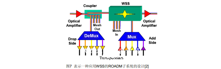光交換元件發(fā)展的下一步是波長選擇開關(guān) (WSS)。與 iPLC相比WSS增加了交換維度,能用來構(gòu)成網(wǎng)格,還可改善直通信道的性能。WSS應(yīng)用于網(wǎng)格節(jié)點開始不久,但WSS模塊已能從幾家供應(yīng)商獲得?,F(xiàn)有的解決方案可在4到10個端口之間交換波長。最初的裝置是用MEMS微鏡的自由空間光開關(guān)將波長引到特定端口。基于液晶和PLC技術(shù)的WSS也開發(fā)完成, 用LC和PLC作成的WSS其優(yōu)點是比較可靠,因為它是固態(tài)器件,沒有活動部分。對PLC構(gòu)成的器件來說,其級聯(lián)能力和插入損耗仍是人們關(guān)注的問題?;贚C的設(shè)備也許能應(yīng)用于有限的光廣播。這可能對節(jié)點設(shè)計有重要意義,它可以明顯降低分束損耗,如果廣播通過光開關(guān)實現(xiàn)。圖7表示一種應(yīng)用WSS的ROADM子系統(tǒng)的設(shè)計,這可以升級為網(wǎng)格[2]。為了支持光廣播,一部分分出信號被送到分出邊,而WSS應(yīng)用于插入邊。