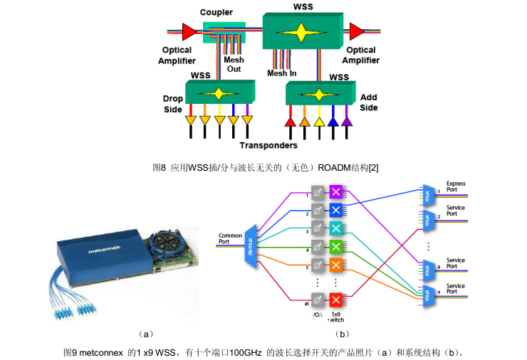 圖9是 metconnex 公司研究開發(fā)的 1x9 WSS,有十個端口的100GHz 波長選擇開關(guān),由PLC和MEMS技術(shù)的混合集成。它可以將每一個輸入波長傳送到9個輸出端口中的任意一個。模塊構(gòu)成包含有解復(fù)用和復(fù)用器、無阻塞開關(guān)、波長阻斷器和可變光衰減器,并具有對每端口每波長功率監(jiān)視的能力,可應(yīng)用于有色或無色的多度ROADM系統(tǒng)。